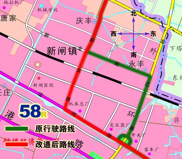 3、58路:由羅溪王下村始發(fā),按原行駛路線行駛至新慶路新龍路路口后,調(diào)整行駛新慶路、運河路、至關河西路按原行駛路線至南大街、西瀛里環(huán)繞往返。撤消原新龍路(新慶路路口至龍江路路口)、龍江路行駛路段。同步撤消原新康路、龍江路、五星橋北上下行??空炯靶虏废滦型?空?,調(diào)整行駛路段增設新龍路、新康花苑、新慶花苑、機床廠、變壓器廠上下行??空尽?br>