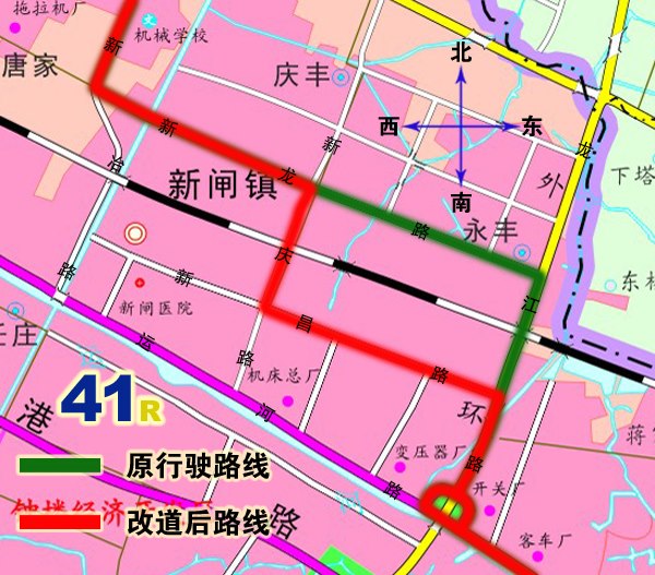 2、41路:由火車站公交中心站始發(fā),按原行駛路線行駛至龍江路新昌路路口后,調(diào)整行駛新昌路、新慶路至新慶路與新龍路路口后,按原行駛路線行駛。撤消原龍江路(新昌路路口至新龍路路口)、新龍路(龍江路路口至新慶路路口)行駛路段。同步撤消原龍江路、新康路上下行??空荆{(diào)整行駛路段增設新昌路下行站,中村、新閘民營工業(yè)園、新康花苑上下行??空尽?/span>