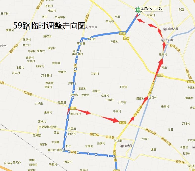 59路:由火車站公交中心站始發(fā),按原線行駛至“新口莊”站點后,調(diào)整行駛S122、S239、孟河大道、金府路、齊梁大道至孟河公交中心站返回。臨時撤銷孟浦線(S122-蔣家巷)、村間道路、齊梁大道(S338-金府路)行駛路段。同步撤銷“楊樹壩、嚴橋村委、嚴橋、禮巷里、孔村、池沿上、蔣家巷”雙向停靠站,調(diào)整行駛路段新增“石橋轉盤、孟河富民小區(qū)”雙向??空尽?br>