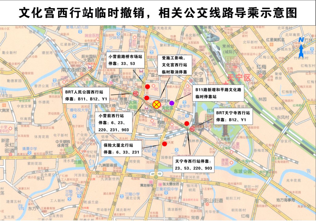 因軌道交通2號線延陵西路(周線里—和平北路)需半封閉施工,受此影響,文化宮西行常規(guī)公交站將被拆除,直接影響到6、23、33、53、220、231、903、B11、B12、Y1路的正常???,經(jīng)現(xiàn)場勘察,常州公交將于10月25日起,臨時撤消上述公交線路文化宮西行??空?。