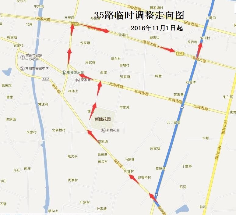 因S122計劃于11月1日通車,同時根據(jù)魏安路施工進度,為方便安家及新魏花園附近居民出行,常州公交將于2016年11月1日起對35路公交作臨時調(diào)整,具體調(diào)整方案如下: