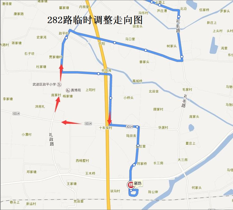 282路:由禮嘉公交中心站始發(fā),按原線行駛至十車垛橋站后順時針環(huán)繞前南公路、禮政路后返回。臨時撤銷前南公路(上陽線—談溝線)、談溝線行駛路段;同步撤銷“上陽橋”西行、“上陽村、十車垛橋”北行停靠站,“陸田舍、小元里、淡溝村”雙向停靠站及“新坊”終點站。繞行路段新增“政平小學(xué)”北行臨時??空?。