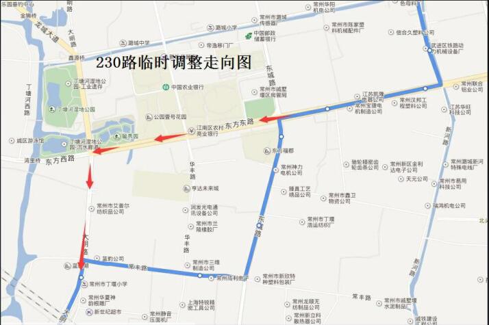 230路:由潞城公交中心站始發(fā),按原線行駛至東方路東城路路口后,調(diào)整行駛東方路、大明路至常豐路路口后恢復原行駛路線;臨時撤銷東城路、常豐路行駛路段,同步撤銷“東城路東方路”南行、“王母墩、常豐村”雙向及“丁堰小學北”東行??空?,調(diào)整行駛路段新增“丁堰小學”北行、“毓秀園”東行、 “東方路華豐路”雙向、“常州經(jīng)濟開發(fā)區(qū)管委會”西行及“大明路東方路”南行停靠站。