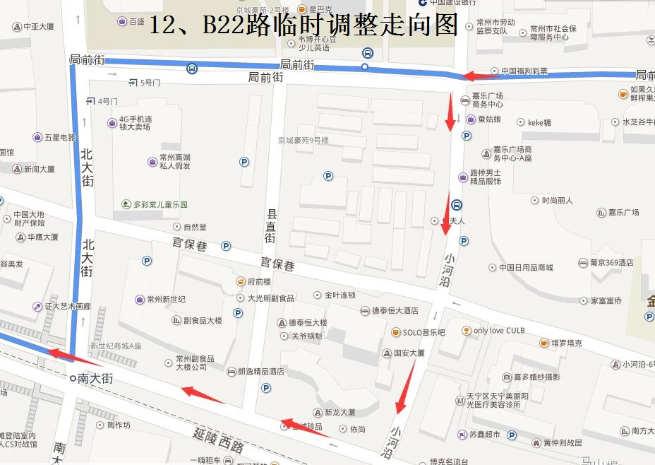 B22路:開(kāi)往常州客運(yùn)中心方向行駛路線保持不變;開(kāi)往花園公交中心站方向,按原線路行駛至局前街小河沿路口后,調(diào)整行駛小河沿、延陵路至北大街路口后恢復(fù)原線路行駛。撤消局前街(小河沿—北大街)、北大街(局前街—延陵路)行駛路段,同步撤消“縣直街”西行??空?,調(diào)整行駛路段增設(shè)“小河沿”南行臨時(shí)??空?。