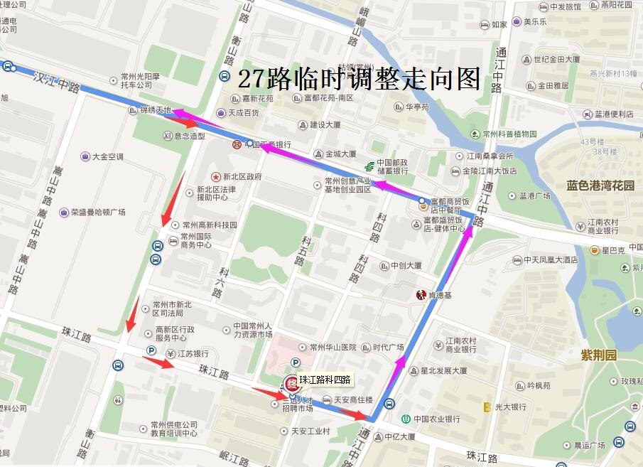 27路:由西夏墅公交中心站始發(fā),按原線路行駛至漢江路衡山路路口后,調(diào)整行駛衡山路、珠江路、通江路、漢江路至衡山路路口后恢復(fù)原線路行駛。撤銷“新北區(qū)政府北、漢江路通江路”東行、“珠江路科四路、常州政務(wù)服務(wù)中心”西行??空?,繞行路段增設(shè)“新北區(qū)政府”南行、“常州政務(wù)服務(wù)中心、珠江路科四路”東行,“漢江路通江路、新北區(qū)政府北”西行臨時停靠站。
