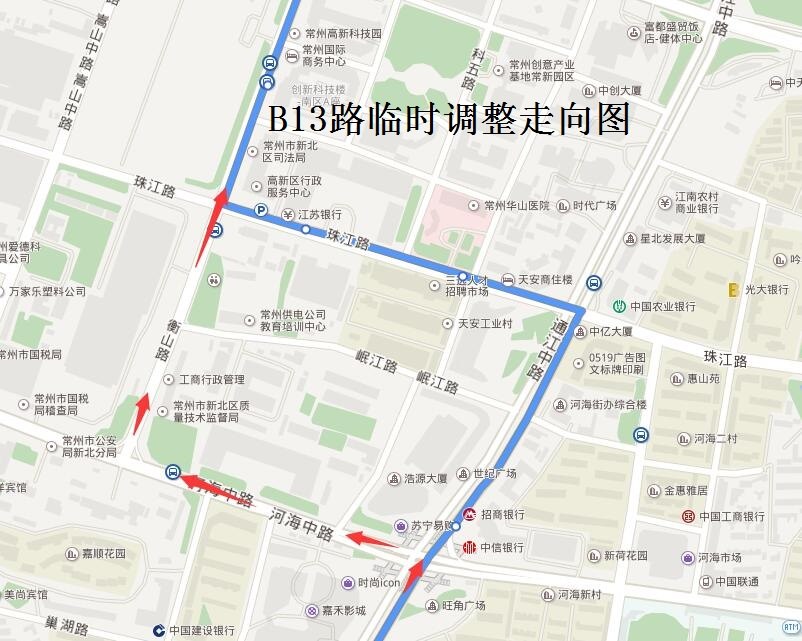 B13路:開往火車站公交中心站方向行駛路線保持不變;開往錦海星城方向,按原線路行駛至通江路河海路路口后,調(diào)整行駛河海路、衡山路至珠江路路口后恢復(fù)原線路行駛。撤銷通江路(河海路—珠江路)、珠江路(通江路—衡山路)行駛路段,同步撤銷“BRT通江路河海路”北行、“珠江路科四路、常州政務(wù)服務(wù)中心”西行??空?,繞行路段增設(shè)“河海路通江路、河海路衡山路”西行,“衡山路珠江路”北行臨時??空?。