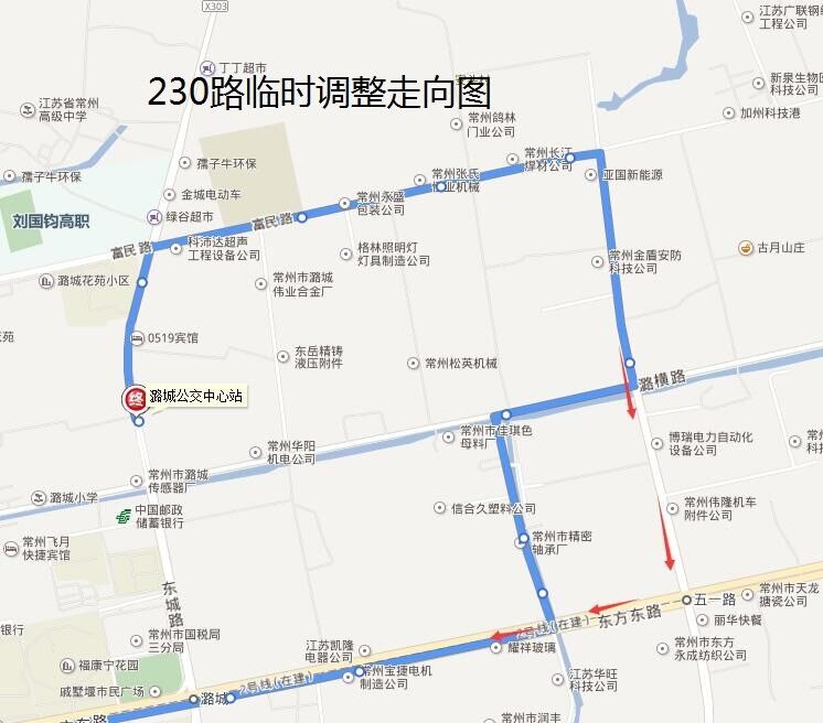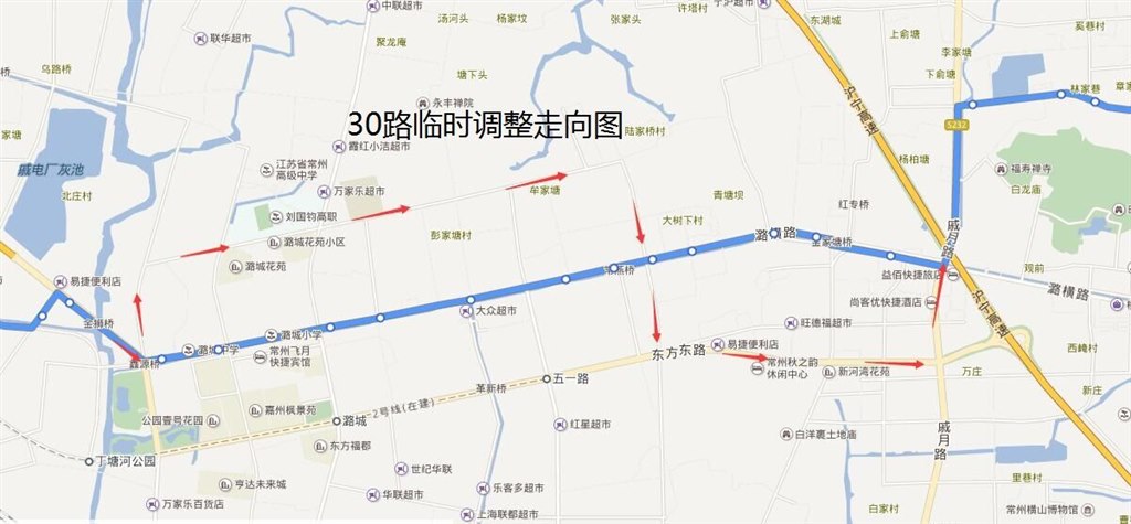 30路:由火車站公交中心站始發(fā),按原線行駛至龍城大道大明路路口后,調(diào)整行駛大明路、富民路、興東路、東方路、S232至潞橫路路口后恢復(fù)原線路行駛;臨時撤銷潞橫路(大明路—S232)行駛路段,同步撤銷“潞橫路龍城大道、潞城、東城橋、陳家塘、彭家塘、光明橋、常燕橋、金豐村、橫山橋金家塘、方家塘、橫山橋農(nóng)副市場西東西向”雙向停靠站,調(diào)整行駛路段臨時增設(shè)“大明路龍城大道、富民路華豐路、潞城花苑北門、富民路東城路、富民工業(yè)園、彭家塘北、東方創(chuàng)新園、東方創(chuàng)新園東、興東路富民路、興東路潞橫路、(上行增設(shè)興東路東方路)、中高村、省莊小區(qū)、(上行增設(shè)常州汽車客運東站)、S232東方路、橫山橋農(nóng)副市場西南北向”雙向??空?。