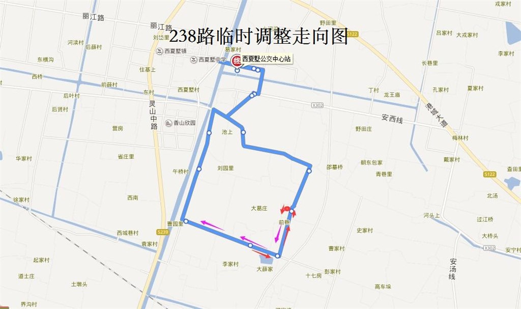 238路:由西夏墅公交中心站始發(fā),按原線行駛至 “東南村委”站后返回。臨時(shí)撤銷“ 王家、高巷里”單向??空?。