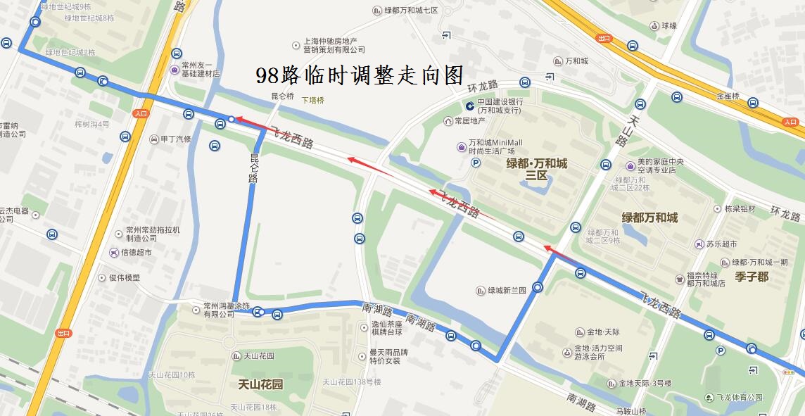 因飛龍路(天山路—昆侖路)南半幅封閉施工,其中環(huán)龍路、昆侖路路口的南口也封閉,受其影響,常州公交將于2017年7月1日起,對涉及的98、1111、1811路公交作臨時調(diào)整,具體方案如下: