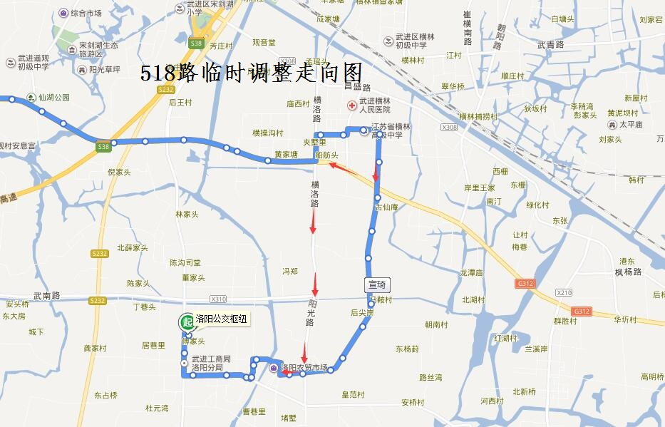 518路:由皮革城路橋(南洋廣場)始發(fā),按原線路行駛至橫洛東路G312路口后,調(diào)整繞行G312、橫洛路至橫洛東路路口后恢復(fù)原線路行駛,撤銷橫洛東路(G312—橫洛路)行駛路段;同步撤銷“彭家頭村、楊岸村、宣琦、馬安橋、前進村、前進橋西、東陳”雙向??空?,臨時繞行路段增設(shè)“橫洛路長虹路、夏家頭、紅星河六號橋、虞橋、墅上橋、黃家頭、戈家頭”雙向臨時停靠站。