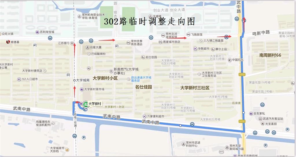 302路:開往大學(xué)新村方向行駛路線保持不變;開往恐龍城公交樞紐方向,由大學(xué)新村始發(fā),調(diào)整行駛鳳棲路、鳴新路至和平路路口后恢復(fù)原路線行駛;臨時撤銷武南路(鳳棲路—和平路)、和平路(武南路—鳴新路)單邊行駛路段,同步撤銷“武南路鳳翔路”東行、“武進(jìn)汽車客運(yùn)站”北行停靠站;調(diào)整行駛路段增設(shè)“機(jī)電學(xué)院、名仕佳園”東向臨時??空?。
