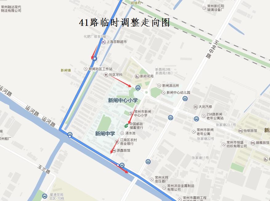 41路:開往湯莊商貿(mào)中心方向行駛線路保持不變;開往火車站方向,按原線路行駛至新冶路新昌路路口后,調(diào)整行駛新昌路、新府路至運河路路口后恢復(fù)原線路行駛。臨時撤銷新冶路(新昌路—運河路)、運河路(新冶路—新府路)行駛路段,同步撤銷“新閘西”東行??空?;調(diào)整路段增設(shè)“新閘街道”東行臨時??空?。