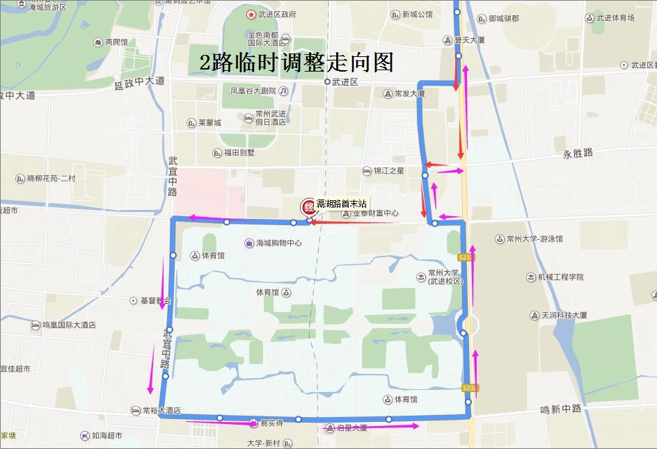 2路:由常州客運中心始發(fā),按原線行駛至和平路延政大道路口后,調(diào)整行駛和平路、永勝路、永安路至滆湖路路口后,臨時繞行滆湖路、蘭陵南路、鳴新中路、和平南路、滆湖中路至永安路路口后按原線路返回,撤銷延政大道(和平路—永安路)、永安路(延政大道—永勝路)行駛路段,臨時繞行路段臨時增設(shè)“武進區(qū)委黨校”雙向及“滆湖路花園街”西行??空荆?ldquo;永安花苑”北行站移至永勝路停靠,繞行路段站點均改為單向??俊?br>