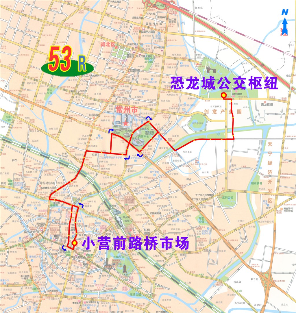 53路:由紅梅公交中心站始發(fā),經(jīng)武青路、延陵中路、延陵西路、晉陵中路、關(guān)河西路、通江南路、錦繡路、晉陵北路、龍錦路、北塘河路、龍匯路、河海路至恐龍城公交樞紐后返回。沿途??考t梅公交中心站、天寧寺、文化宮、小營前路橋市場、常州賓館、晉陵路博愛路、北直街小區(qū)、青山橋、西新橋、通江路崇文路、萬福橋、金百國際、常州衛(wèi)校、市政務(wù)服務(wù)中心、市政務(wù)服務(wù)中心東、常州大劇院、龍錦路晉陵路、龍錦路天目山路、綠洲家園、北塘河路龍錦路、北塘河路青豐路、城建檔案館、北塘河路東經(jīng)120、龍匯橋、龍匯路太湖路、龍匯路河海路、恐龍城公交樞紐。