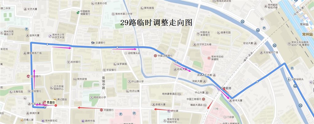 29路:由龍虎塘公交樞紐始發(fā),按原線路行駛至武青北路和平路路口后,環(huán)繞和平路、局前街、北大街、博愛路至和平路路口后按原行駛路線返回。臨時撤消晉陵路(局前街—博愛路)行駛路段,同步撤銷“椿庭橋、博愛路太平橋路、博愛路晉陵路、東橫街健身路”西行、“縣直街”東行、“常州賓館、娑羅巷幼兒園”北行??空荆{(diào)整行駛路段增設(shè)“明都大酒店”南行、“第一醫(yī)院”西行、“縣直街”西行、“北大街”北行、“東橫街健身路、博愛路晉陵路”東行臨時??空?。