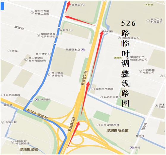 526路:由飛龍首末站始發(fā),按原行駛路線行駛至龍江路龍城大道路口后,臨時(shí)調(diào)整行駛龍江路、河海西路,至河海西路順園路路口后,恢復(fù)原行駛路線至薛家公交中心站。臨時(shí)撤消龍城大道(龍江路—順園路)、順園路(龍城大道—河海西路)行駛路段,同步撤消“悠活城西門、順園路富強(qiáng)路”雙向停靠站。遷移“龍江立交”西行站至龍江路上???。