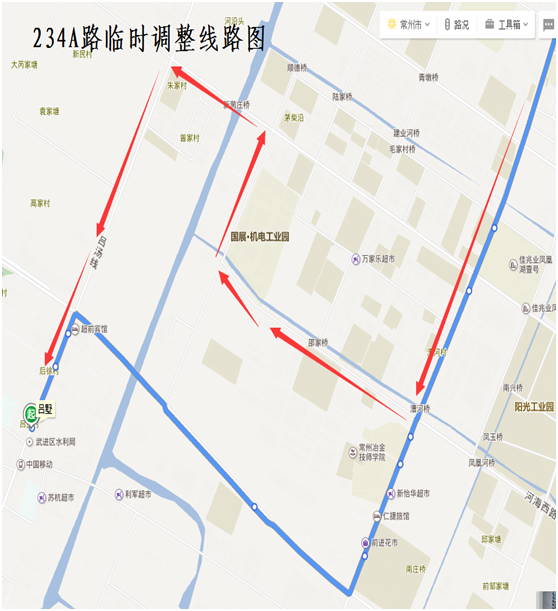 234A路:由薛家公交中心站始發(fā),按原行駛路線行駛至薛冶路河海西路路口后,臨時(shí)調(diào)整行駛河海西路、春江路、漢江西路、呂湯路,至呂湯路龍城大道路口后,恢復(fù)原行駛路線至呂墅。臨時(shí)撤消新冶路(河海西路—龍城大道)、龍城大道(薛冶路—呂湯路)行駛路段,同步撤消“新冶路河海路、常州冶金技師學(xué)院、前進(jìn)村委、新閘前進(jìn)村”雙向??空?。臨時(shí)調(diào)整路段增設(shè)“野田里、國展機(jī)電園西、河海路春江路、邵家橋、河海路薛冶路”雙向??空尽?/span>