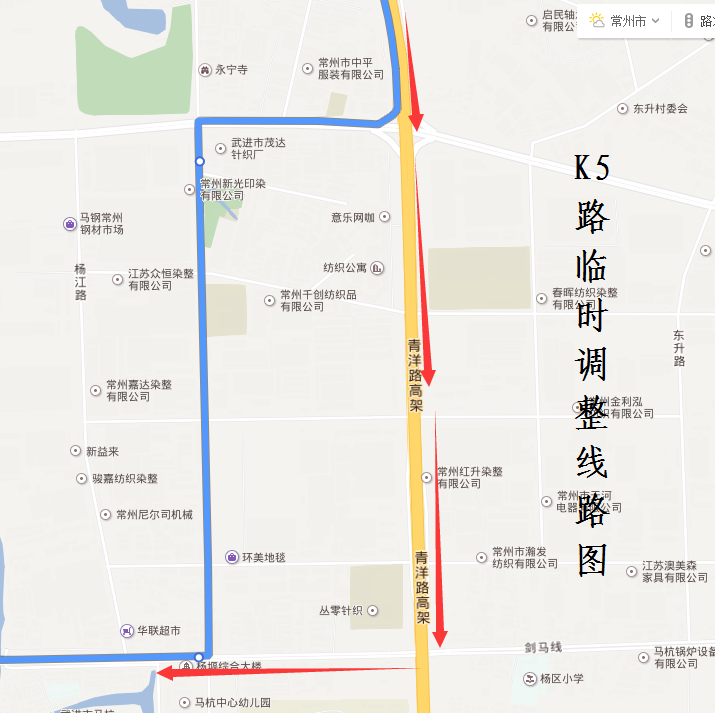 K5路:由潞城公交中心站始發(fā),按原線行駛至青洋路人民路路口后,臨時(shí)調(diào)整行駛青洋路、廣電路,至廣電路鳳凰南路路口后,恢復(fù)原行駛線路至淹城公交樞紐返回。撤消人民路(青洋路—鳳凰南路)、鳳凰南路(人民路—廣電路)行駛路段,同步撤消“鳳凰路人民路(南行)”、“采菱家園(西行)”、“鳳凰路廣電路(北行)”、“永寧寺(東行)”??空?。