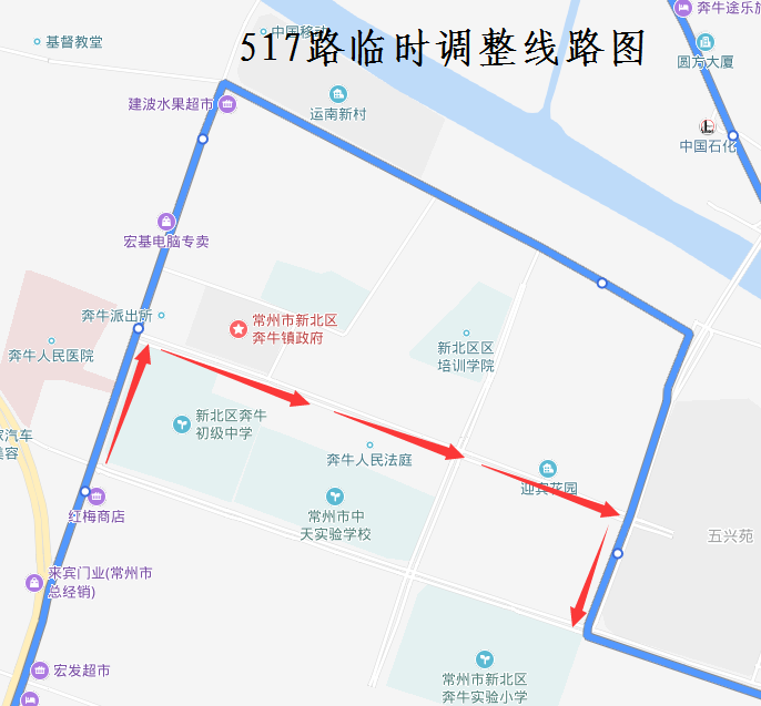 517路:由皮革城路橋(南洋廣場(chǎng))始發(fā),按原線行駛至天禧路迎賓路路口后,臨時(shí)調(diào)整行駛迎賓路,至迎賓路興苑路口后,恢復(fù)原行駛線路至奔牛萬(wàn)家富。撤消天禧路(迎賓路—運(yùn)南路)、運(yùn)南路(天禧路—興苑路)、興苑路(運(yùn)南路—迎賓路)行駛路段,同步撤消“天禧橋”、“奔牛福利院”雙向??空?,臨時(shí)調(diào)整路段增設(shè)“奔牛鎮(zhèn)政府”、“奔牛土管所”雙向臨時(shí)停靠站。