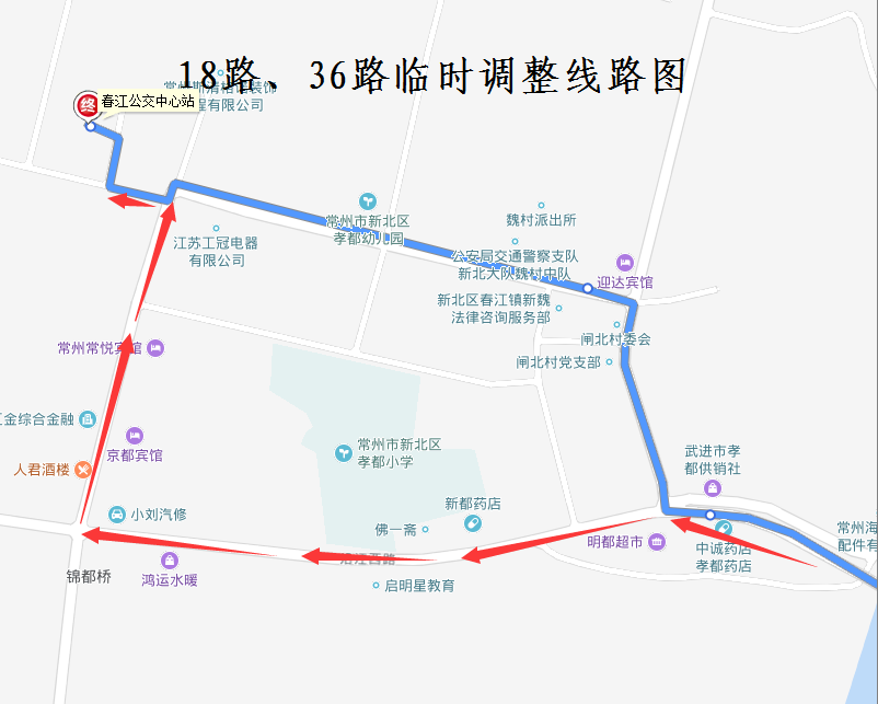 18路:由火車(chē)站公交中心站始發(fā),按原線路行駛至沿江西路弘都路路口后,臨時(shí)調(diào)整行駛沿江西路、錦都街,至春江公交中心站。臨時(shí)撤銷(xiāo)弘都路(沿江西路—鑫都街)、鑫都街(弘都路—錦都街)行駛路段,同步撤消“魏村派出所”西行??空?。“弘都新村”北行??空具w移至沿江西路上???。春江公交中心站至火車(chē)站公交中心站方向行駛路線不變。